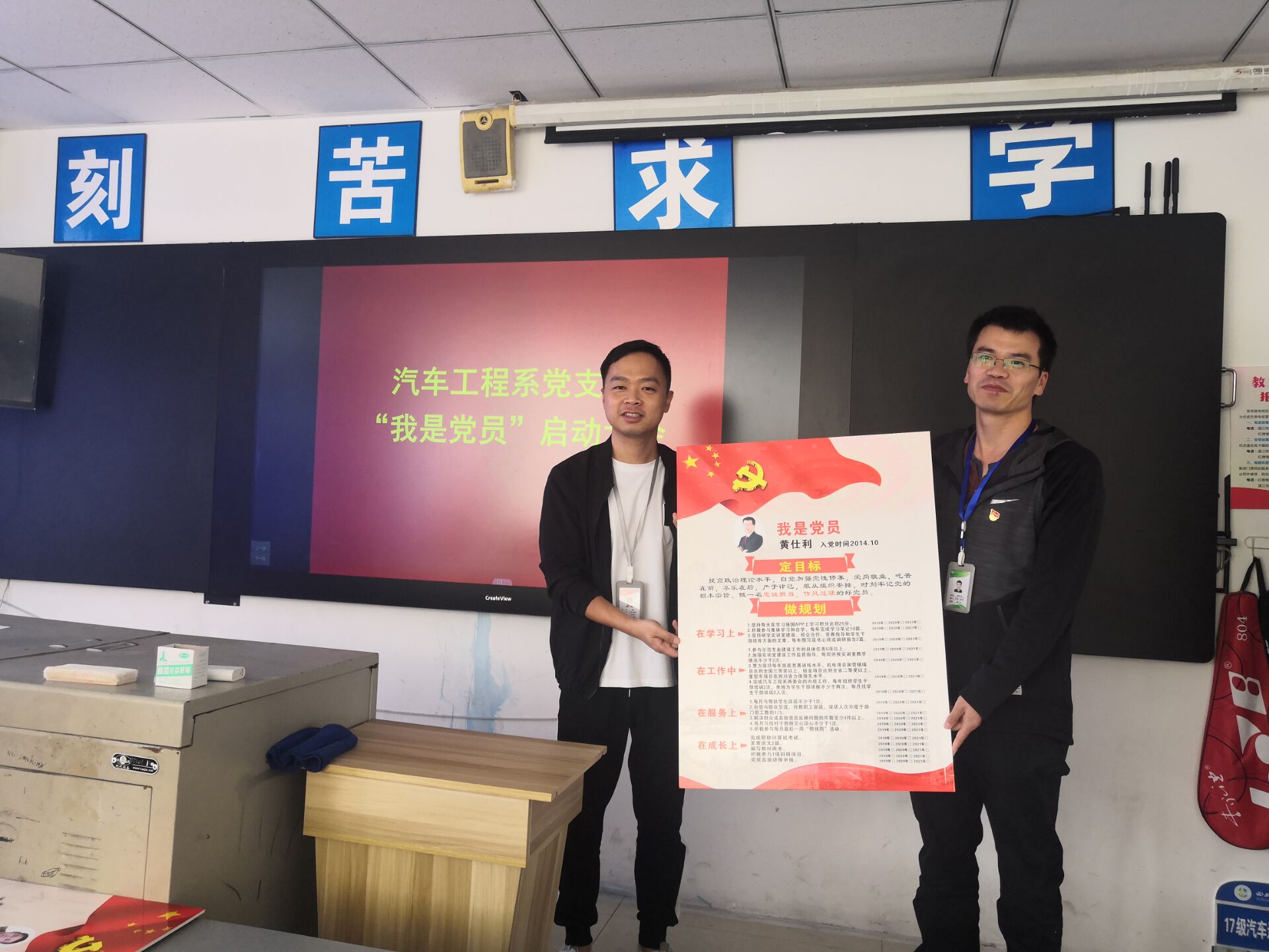汽车党支部“我是党员”活动采取党员个人提、支部分类定、支部统一推的方式,促进党员在不同岗位发挥先锋模范作用。本次活动是结合汽车系党支部创建五好党支部具体工作的落实,也是汽车系党支部开展“不忘初心、牢记使命”的有效载体,支部带领党员做好“四部曲”,即亮身份、定目标、做规划、受监督践,结合党员岗位工作职责和自身发展做出公开承诺。
