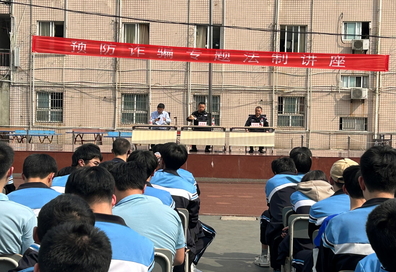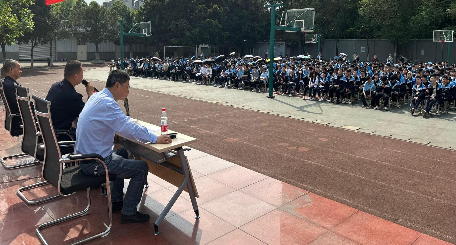 全校师生在运动场整齐列队,认真聆听汪所长宣讲的电信网络诈骗的主要特点和常见诈骗手法。汪所长通过详细剖析在我们身边发生的典型案例,对电信诈骗的种类、惯用手段及防范措施进行了充分且生动的展示。同时,动员同学们向身边的亲人、朋友普及防诈骗知识、安装防骗反诈APP等,提高自我防护能力。汪所长还运用校园欺凌、“黄、赌、毒”相关案例对学生进行了法制教育。